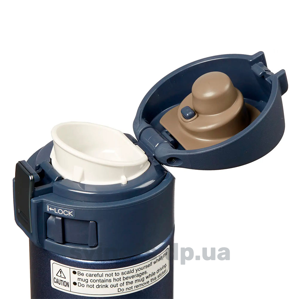 На крышке расположена кнопка, которая интуитивно нащупывается большим пальцем, таким образом открывать и закрывать термокружку можно одной рукой. Блокиратор - специальный замок не дает случайно открыться во время транспортировки.