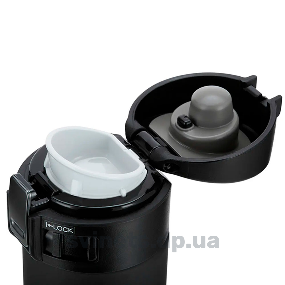 На крышке расположена кнопка, которая интуитивно нащупывается большим пальцем, таким образом открывать и закрывать термокружку можно одной рукой. Блокиратор - специальный замок не дает случайно открыться во время транспортировки.