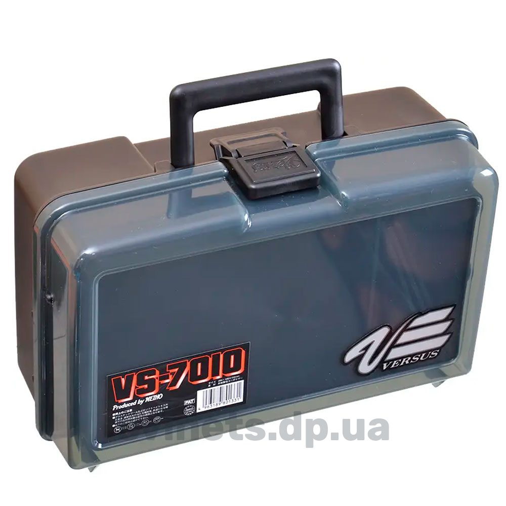 Скриня Meiho Versus VS-7010 Tackle Box – універсальне сховище для рибальських снастей, всередині цього переносного боксу можна впорядкувати та транспортувати різноманітне рибальське приладдя – інструменти, приманки, оснастки та багато іншого. Конструкція являє собою основний корпус, у середині якого розташовуються дві полиці на рухомих кронштейнах. При відкритті ящика полиці розсуваються за принципом антилевер та надають зручний доступ одночасно до всього вмісту кейсу. Піддон ящика також служить, як відділення для снастей. Кожна полиця і нижній піддон ящика комплектуються 4-ма перегородками, що знімаються, їх можна довільно встановити в слоти на стінках, завдяки чому є можливість регулювання розмірів кінцевих відділень. Перегородки піддону у верхній частині мають спеціальні прорізи, в які зачіплюються гачки приманок для підвішування блешень, воблерів тощо. Прозора кришка ящика із зручною ручкою для перенесення з'єднується з нижньою частиною за допомогою надійних шарнірних петель та закривається на надійну шарнірну клямку, завдяки чому досягається довгий ресурс роботи цих вузлів. Ящик Meiho Versus VS-7010 Tackle Box – відмінний варіант для коротких виїздів на риболовлю, його продумана конструкція забезпечує дбайливе зберігання рибальського приладдя та зручний доступ до снастей у процесі лову.