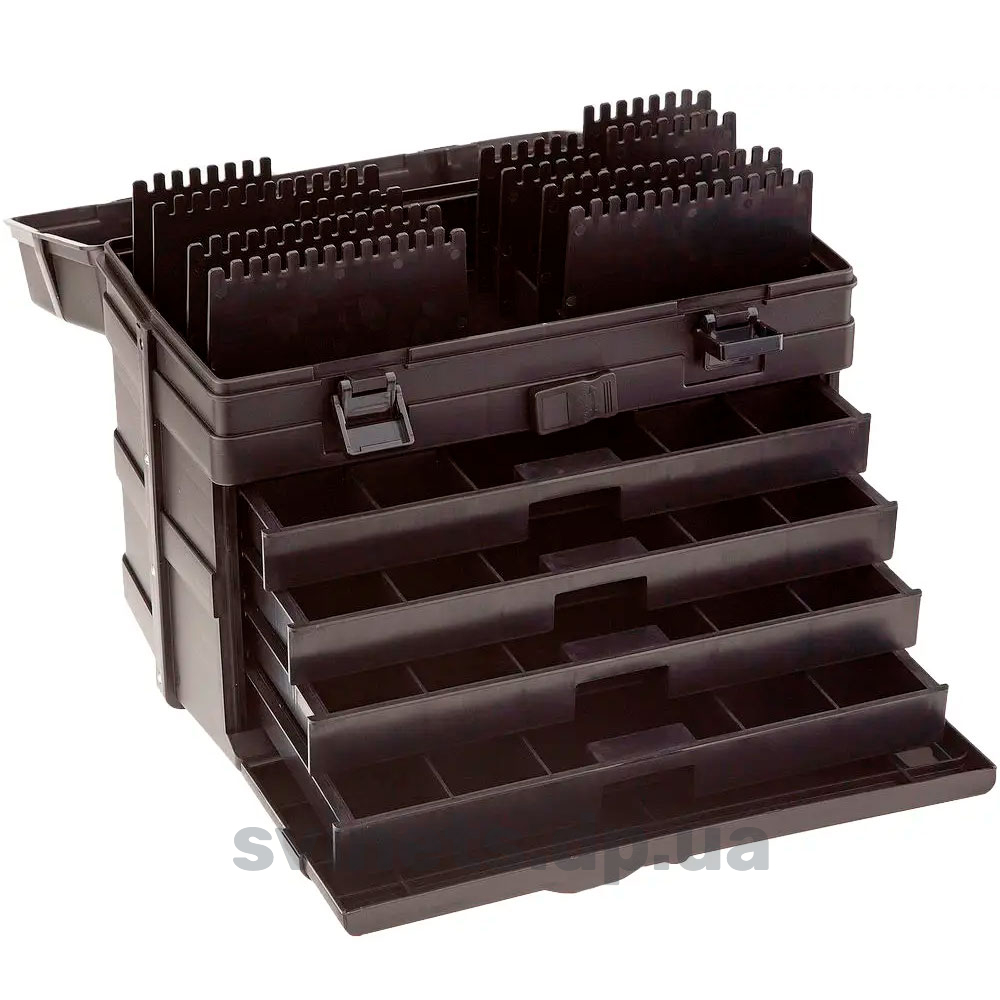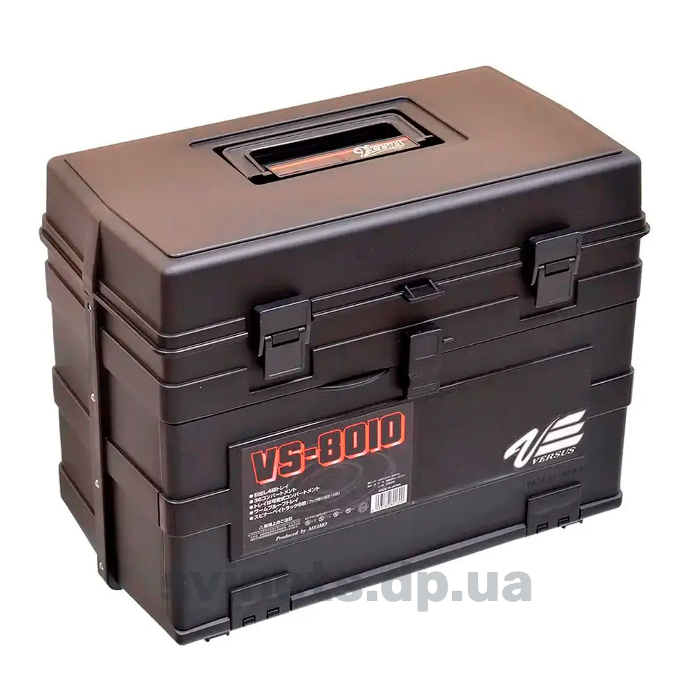 Ящик Meiho Versus VS-8010 від японського виробника - хороший вибір для рибалок які люблять тримати снасті і приманки в порядку. Завдяки інноваційному матеріалу - сополимеру, вдалося зменшити вагу ящика при цьому зберегти його ударостійкість і стійкість до подряпин. Він має чотири місткі висувні лотки з регульованими відсіками, здатних розмістити велику кількість приманок, аксесуарів і корисних дрібниць необхідних на риболовлі. Зверху біля ручки є спеціальне відділення з кришкою для того, щоб у рибалки під рукою завжди були улюблені приманки. Дно валізи оснащене антиковзаючими ніжками.