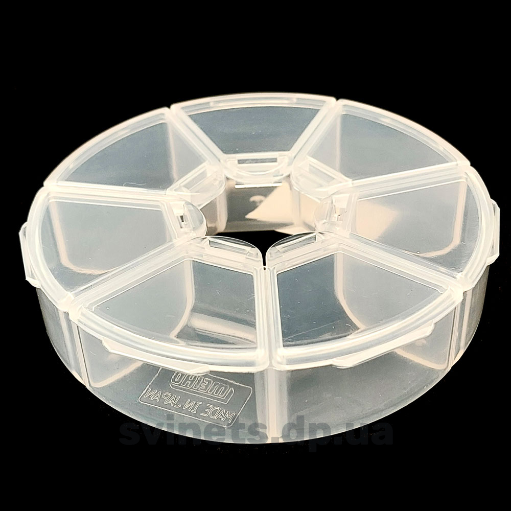 Компактне і надійне рішення для акуратного зберігання дрібних рибальських снастей. Завдяки круглій формі і прозорому корпусу, він зручний у використанні і дає змогу швидко знайти потрібні аксесуари, не відкриваючи кришку. Корпус виконаний з міцного поліпропіленового пластику, стійкого до механічних пошкоджень і впливу вологи. Прозора конструкція дозволяє легко переглядати вміст, що особливо важливо в умовах риболовлі, коли час на пошук потрібного оснащення обмежений. Усередині кейса розташовано 7 окремих відділень, кожне з яких має свою власну відкидну кришку. Таке рішення допомагає тримати снасті організованими, запобігає їхньому змішуванню і захищає від випадкового випадання. Кожна кришка надійно фіксується пластиковими засувками, що унеможливлює мимовільне відкриття під час транспортування або перенесення. Кейс Meiho PC-97 оптимально підходить для зберігання гачків, вантажив, стопорів, вертлюжків, заводних кілець та інших невеликих елементів оснащення. Його зручно взяти з собою на водойму, розмістити в рюкзаку або в кишені рибальської жилетки. Компактні розміри (діаметр 91 мм і висота 25 мм) і легка вага (всього 31 грам) дають змогу економити місце, не перевантажуючи екіпіровку. Окремі комірки розміром 34 × 26 × 19 мм забезпечують достатньо простору для акуратного розміщення снастей різного розміру. Надійні засувки гарантують безпеку вмісту навіть за активної експлуатації в польових умовах.