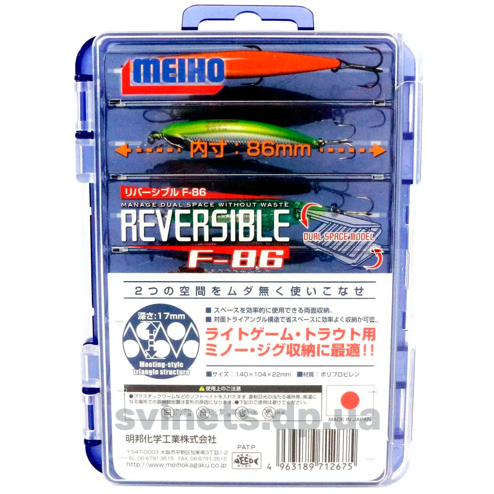 Коробки серії Meiho Reversible з вертикальними відділенннями для зберігання і транспортування воблерів. Виготовлені зі стійкого до подряпин матеріалу - поліпропілену та оснащені надійними застібками. Завдяки двосторонній конструкції і формі відділень, дозволяють помістити велику кількість приманок. Трійники лягають в спеціальні поглиблення і не дряпають покриття воблерів. На кришці і перегородках передбачені вентиляційні отвори (крім коробки Meiho Reversible 85), щоб волога, яка залишилася на приманках після риболовлі, могла випаруватися. У закритому стані коробка має компактні розміри, тому її зручно переносити в рибальському сумці або рюкзаку.