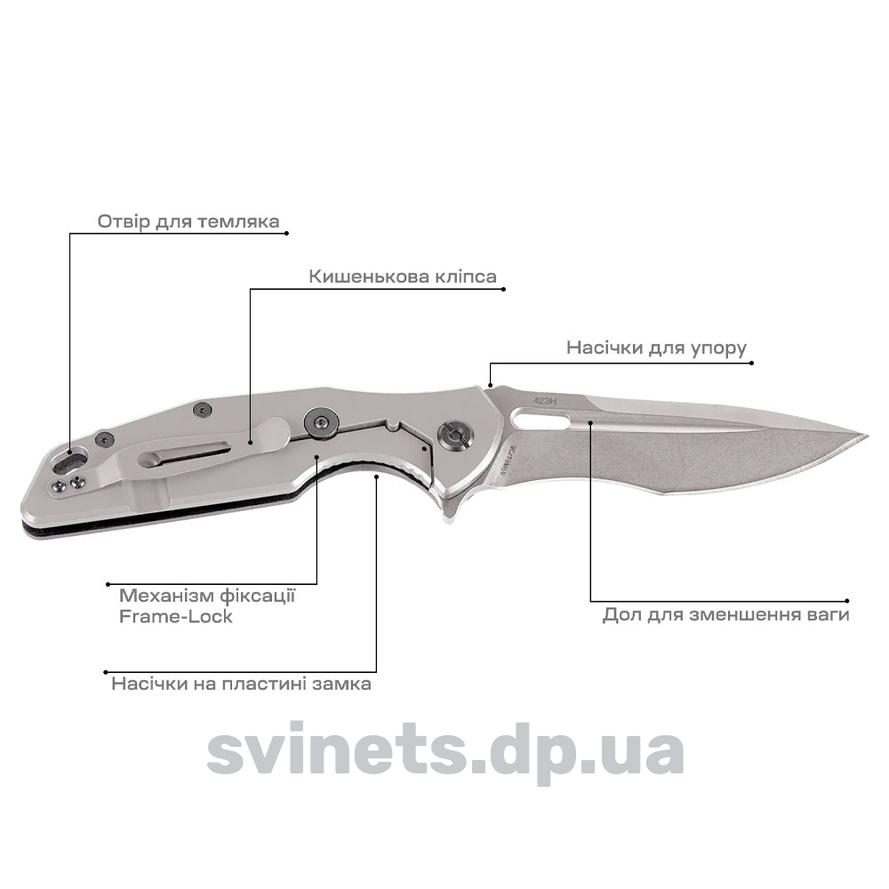 Прямі спуски починаються з 1/3 від обуха, на верхній його частині присутнє фальшлезо і невелика насічка на упорі під великий палець. Форма клинка являє собою поєднання Drop-Point і S-подібного клинка, завдяки чому має відповідні переваги. Подовжена різальна кромка покращує різальні властивості, а досить потужна передня частина з фальшлезом продемонструє прекрасні колючі якості.